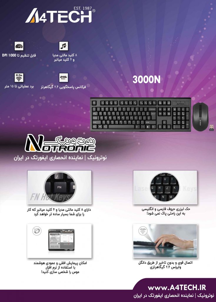 کیبورد مجموعه ۳۰۰۰N تعداد ۱۰۴ کلید دارد. این محصول از نوع بی سیم است و از طریق یک دانگل وایرلس به دستگاه شما وصل می شود. این کیبورد ۵۶۰ گرمی از ۲ عدد باتری نیم قلم نیرو می گیرد و دارای فناوری کنترل مصرف باتری است.