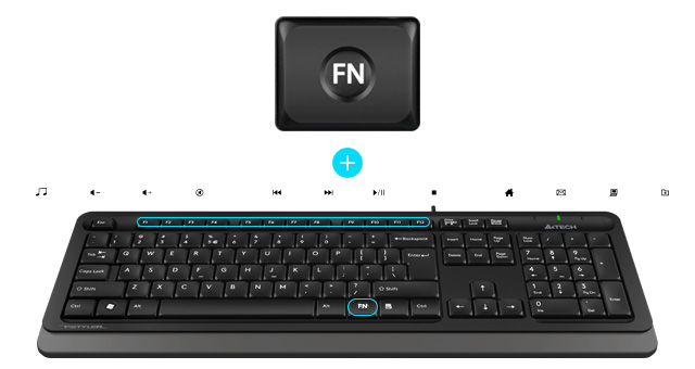 یک اشاره برای دسترسی به ۱۲ عملکرد چندرسانه ای و اینترنت با کلیدهای FN+ F1 تا F12. غشای سیلیکونی با الاستیسیته بالا برای تجربه تایپ سریع و راحت طراحی این کیبورد به گونه ای است که قطرات آب به برد نمیرسد و حفره هایی دارد که آنها را به بیرون هدایت میکند.